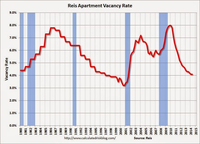 And rental vacancies continue to fall, which means both rising prices, and less available rental units, another incentive for home seekers to buy. The best vacancy survey is by Reis, the apartment info data site. Vacancy was unchanged during the second quarter at 4.1 percent, said Reis, a slight worsening versus last quarter. But over the last twelve months the national vacancy rate has declined by 20 basis points, slightly below the pace of the last few quarters.