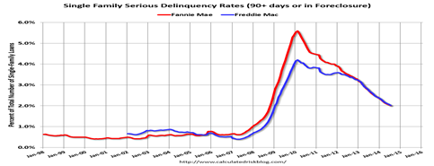 The major reason for less investor demand is the fall in foreclosures and delinquent mortgages, as we said. Fannie Mae reported today that the Single-Family Serious Delinquency rate declined in July to 2.00 percent from 2.05 percent in June. The serious delinquency rate is down from 2.70 percent in July 2013, and this is the lowest level since October 2008.