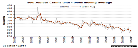 And initial jobless claims continue downward, another sign that the unemployment rate should fall further tomorrow. There are fewer and fewer workers drawing unemployment benefits which points solidly at improvement underway in the labor market. Initial claims fell 8,000 in the September 27 week to 287,000, pulling down the 4-week average by a sizable 4,250 to 294,750 which is nearly 10,000 below the month-ago comparison.