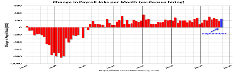 “Clearly state and local employment is now increasing,” says Calculated Risk’s Bill Mcbride. “And Federal government layoffs have slowed (payroll decreased by 2 thousand in September), but Federal employment is still down 25,000 for the year.”