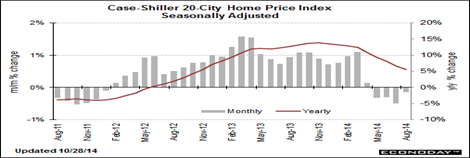 Home prices contracted for a 4th straight month in August in Case-Shiller 20-city data, down 0.1 percent vs expectations for a gain of 0.1 percent. This is while consumer confidence rose to a post-recession high, a good sign for increased holiday spending.