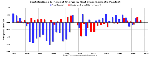 This first graph from Calculated Risk shows the increasing contribution to GDP for residential investment (RI) and state and local governments since 2005. It’s the beginning of recovery from the huge slump in RI during the housing bust (blue), followed by the unprecedented period of state and local austerity (red) not seen since the Depression.