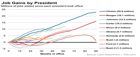 The economy has 6.1 million more jobs today than when Mr. Obama took office in January of 2009. That puts his total job creation ahead of presidents John Kennedy, Gerald Ford, and George H.W. Bush, who each served one term or less. It also puts him well ahead of President George W. Bush, whose final year in office also comprised the beginning to the longest and deepest recession since the Great Depression.