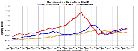 And sure enough, the U.S. Census Bureau of the Department of Commerce said that construction spending during October 2014 was estimated at a seasonally adjusted annual rate of $971.0 billion, 1.1 percent above the revised September estimate of $960.3 billion.