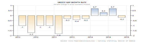 So Greece has little choice but to exit the euro currency, unless some last minute compromise with the EU is possible. Its unemployment rate is currently 25.8 percent, the worst in the Eurozone (slightly more than Spain’s 23.7 percent), as it has been in a deflationary spiral, further depressing its economic activity.