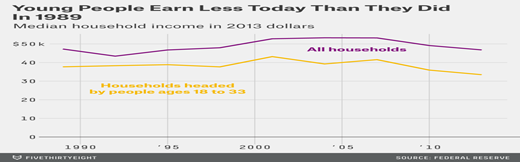 And we said last week that analyzing about three decades of census data—from 1980 to 2012—the  Federal Reserve’s 2013 Survey of Consumer Finances found that on average, young workers are now 30 years old when they first earn a median-wage income of about $42,000, a marker of financial independence, up from 26 years old in 1980.