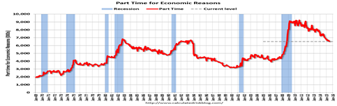 But there is still a lot of labor slack in our job market that Fed Chair Yellen has been talking so much about. This is most evidenced by part-timers who would rather work fulltime, according to the BLS. Their numbers are declining, from 6.65 million to 6.51 million in one month, but would still have to drop by one-third to return to the range that prevailed from the 1970s until the start of the Great Recession in this Calculated Risk graph.