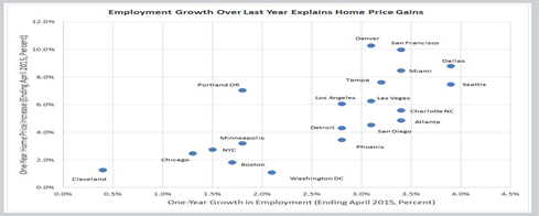 The S&P Case-Shiller Home Price Index is the bell weather for real estate and home prices these days. It not only reports housing prices, but what affects those prices, and jobs have to be the most important indicator of housing health. So it’s probably not surprising that cities in the Case-Shiller 20-city index that have the fastest job growth also have the highest price growth.