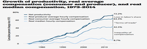 “Since 1973, hourly compensation of the vast majority of American workers has not risen in line with economy-wide productivity,” say the EPI authors. “In fact, hourly compensation has almost stopped rising at all. Net productivity grew 72.2 percent between 1973 and 2014. Yet inflation-adjusted hourly compensation of the median worker rose just 8.7 percent, or 0.20 percent annually, over this same period, with essentially all of the growth occurring between 1995 and 2002.”