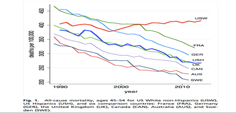 This Paul Krugman graph shows the deaths from all causes for both white and Hispanic populations. The red line trending upward since 1990 is that of US White, non-Hispanics, vs. the declining blue line for US Hispanics. In other words, the US has the only (white) population of all developed countries whose death rates are increasing.
