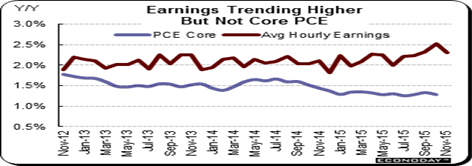 Another telltale sign of continued growth are the low inflation numbers, combined with barely rising incomes. Year-on-year, as seen in the dark line of the graph, average hourly earnings dipped 2 tenths to 2.3 percent, says Econoday. Whereas the Fed’s central inflation gauge, core PCE prices, are up just 1.3 percent. It’s the light blue line in the graph, and has been trending lower for the past year. When energy and food are included, the PCE drops to a year-on-year rate of only plus 0.2 percent.