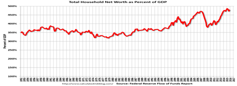 The net worth of households and nonprofits as a percentage of Gross Domestic Product rose to $86.8 trillion during the fourth quarter of 2015, said the Fed. The value of directly and indirectly held corporate equities increased $758 billion and the value of real estate rose $458 billion. Consumers’ net worth is now the highest in history in this graph that dates back to 1952. This includes real estate and financial assets (stocks, bonds, pension reserves, deposits, etc.) net of liabilities (mostly mortgages).