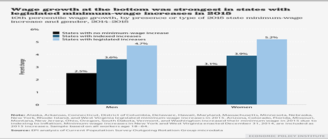 So raising the minimum wage floor is a start. In fact, states that have already raised the minimum wage have boosted wages of the bottom 10th percentile—as much as 5.2 percent for women in states where it was legislated, vs. states with no minimum wage increase.