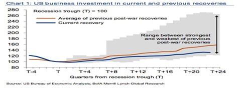 This dearth of aggregate demand has happened at the same time as diminished corporate investment in more productive capacity, according to a recent Bank of America report. “Since the Great Recession, US business investment has grown at an average annual rate of 4.9 percent, compared with the 8.1 percent average for the corresponding period of all post-war recoveries. This shortfall is a much larger than the 1.8pp shortfall for household consumption, and the 2.0 pp for residential investment.”