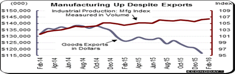 The manufacturing component of the industrial production report posted a surprising 2 tenths gain in February last week, which came on top of January’s stunning gain of 0.5 percent. Exports aren’t specifically tracked in any of these reports but the implication is clear, says Econoday that this year’s steep and early decline in the dollar, down 3.8 percent on the dollar index, is making our exports less expensive to our foreign customers.
