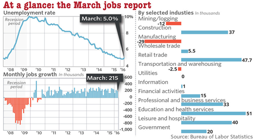Are we approaching full employment will be the debate raging within the Federal Reserve and beyond this year. That’s because, “Total nonfarm payroll employment rose by 215,000 in March, and the unemployment rate was little changed at 5.0 percent,” the U.S. Bureau of Labor Statistics reported today. “Employment increased in retail trade, construction, and health care. Job losses occurred in manufacturing and mining, only.”