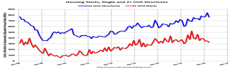 And privately-owned housing units authorized by building permits in March were at a seasonally adjusted annual rate of 1,086,000. This is 7.7 percent below the revised February rate of 1,177,000, but is 4.6 percent above the March 2015 estimate of 1,038,000.