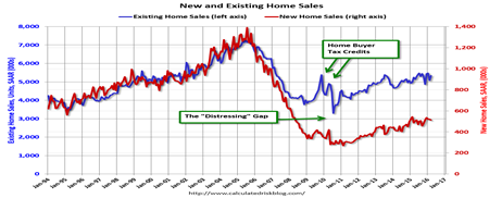 What will it take to bring new-home sales back to historical levels? There is a “Distressing” Gap between new and existing-home sales, says Calculated Risk, whereas they matched during more normal times and only began to diverge in 2006 at the top of the housing bubble.