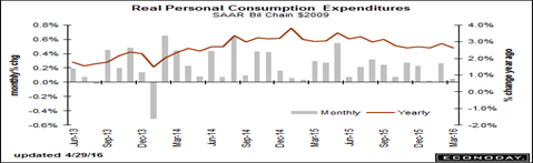 And today’s Personal Income and Outlays reports showed consumer spending was still weak in March, though net weakness in the quarter was tied largely to what is a positive for the consumer, lower fuel prices. Spending on non-durables (i.e., services) is a clear weakness in the report, up an unusually low 0.1 percent in the month.
