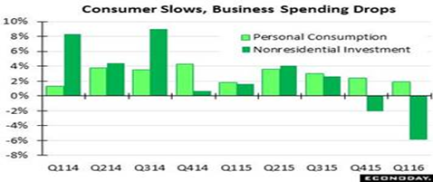 This graph shows what corporations haven’t done with their profits, here called nonresidential investments, as a percentage of GDP growth. The largest negative component of Q1 Gross Domestic Product (up just 0.5 percent in initial estimate) was business spending as nonresidential fixed investment. It fell 5.9 percent for a second drop in a row. Business spending had been a plus for GDP until the last two quarters.