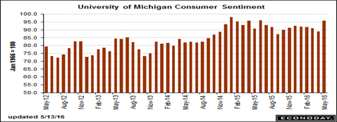 Is this causing the spike in consumer sentiment? Consumer sentiment is absolutely soaring so far this month, in the opinion of Econoday, up nearly 7 points to 95.8 for the mid-month flash. This is the best reading since June last year.