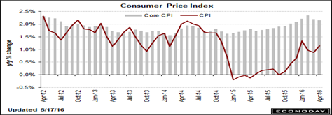 Where’s the inflation? It is barely rising, as consumers still wait for bargains, before they decide to buy. The overall Consumer Price Index in April rose just 1.1 percent, and is up 2.1 percent less food and energy prices, which have been falling this year.
