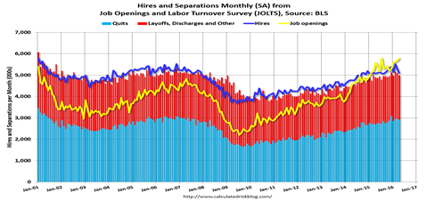 The U.S. Bureau of Labor Statistics reported the number of job openings was little changed at 5.8 million on the last business day of April, in its JOLTS report. (But that’s not exactly true, as it is up from 5.58 million openings in April 2015.) Hires (blue line in graph) edged down to 5.1 million while separations were little changed at 5.0 million. That means there are many more jobs available than workers to fill those jobs. We are approaching full employment, in other words. And who has most benefited?