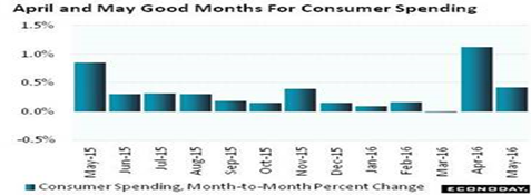 April’s 1.1 percent consumer spending gain was the best monthly gain of the cycle since August 2009. And May’s gain of 0.4 percent was the second best since November last year. So April and May together track at 4 percent annualized growth which has lifted outside expectations for 3 percent growth in second-quarter GDP, as we said.