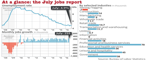Total nonfarm payroll employment rose by 255,000 in July, and the unemployment rate was unchanged at 4.9 percent, said the U.S. Bureau of Labor Statistics today. This confirms earlier reports from the manufacturing and service sectors that economic activity is strong.