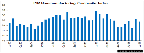 This is while the just reported ISM’s non-manufacturing (i.e., service sector) composite index did slip 1.0 point to 55.5 but new orders rose in July, up 4 tenths to 60.3 for the best showing since October last year.