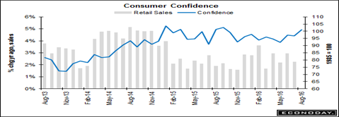 US consumers are feeling good, with higher confidence and rising wages pushing demand for housing and consumer spending. The Conference Board’s Consumer Confidence Index rose a huge 4.4 points to 101.3 in August. It has been hovering in this range for more than one year, reflecting the strong jobs market.