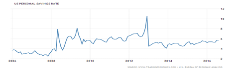 So will such low rates continue? The simplest economic answer is there’s not much demand for money at the moment, in relation to the amount of money either in circulation or being saved by companies and individuals. This is evidenced by the record amount of cash or other readily sellable assets—some $4.5 trillion in such assets are being held by corporations both home and abroad—and the 5.7 percent personal savings rate, which is up from its historical low of 1.9 percent in 2005, per the graph below.