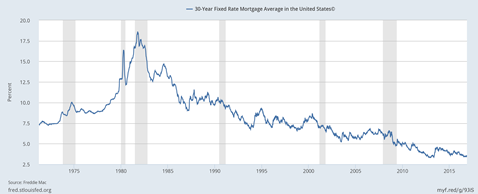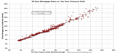 We are therefore lucky at this late stage of a recovery to still see 4 percent fixed mortgage rates. One can see when the 10-year yield returns to a more normal 3.5 to 4 percent yield, fixed mortgage rates could almost double.