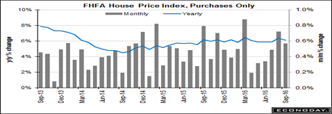 FHFA house price index eased slightly in September and was up 0.6 percent after increasing 0.7 percent in August. On the year, the FHFA index surged to plus 6.1 percent, down from August’s gain of 6.4 percent. In the third quarter, house prices were up 1.5 percent and were 6.1 percent higher than the third quarter in 2015.