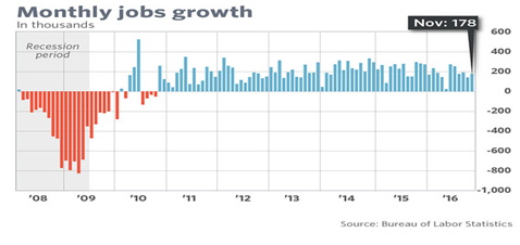 A negative is an 8,000 decline in retail which indicates that retailers are not gearing up much for the holidays. But that may be because of higher online retail sales. Thus far in 2016, employment growth has averaged 180,000 per month, compared with an average monthly increase of 229,000 in 2015.