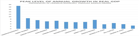 That is why real annual GDP growth during Reagan’s term peaked at 7.3 percent, and GW Bush’s term at 3.8 percent. The highest modern growth rate was achieved during FDR’s New Deal and WWII, which boosted U.S. growth to a peak of 18.9 percent in 1942. Real GDP growth (i.e,, after inflation) has been downhill ever since.