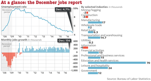 The highlight of the December unemployment report was that wages rose 2.9 percent annually. And nonfarm payrolls rose a lower-than-expected 156,000 in December but added a net 19,000 to the two prior months (November now at 204,000 and October at 135,000) in revisions, said the U.S. Bureau of Labor Statistics.