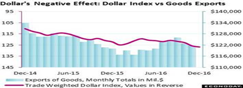 But the rise in interest rates may slow down growth in 2017, as Econoday reports the rise in the dollar is affecting export prices and a consequent slowdown in exports. The worst economic news of late comes from the international trade in goods report where the deficit widened sharply in November to $65.3 billion from October’s $61.9 billion, reports Econoday. Goods exports fell 1.0 percent in the month to $121.7 billion as tracked in the blue columns of the graph. Food exports have been especially soft as have vehicle exports, and capital goods exports fell very sharply in a reminder that the lack of business investment is a global issue.