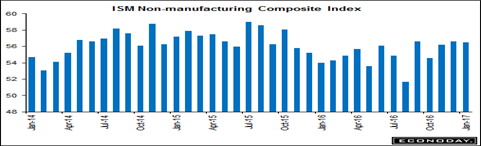 More big news was that the service sector is still booming, though it dropped slightly in January. The ISM non-manufacturing, or service sector index “The NMI® registered 56.5 percent which is 0.1 percentage point lower than the seasonally adjusted December reading of 56.6.
