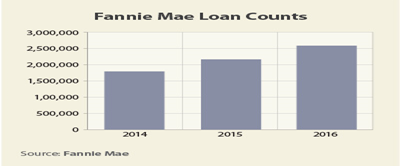 In other words, Fannie and Freddie are the most important sources of liquidity in the single-family mortgage market. Fannie Mae saw the more significant gains over 2015. Fannie’s 2016 loan volume of $512.6 billion was 34 percent higher than in 2014, and its loan count rose by nearly 18 percent, to 2.5 million loans. Notably, Fannie experienced an 84 percent year-over-year surge in refinance activity in the fourth quarter, to 459,000 refis, up from 249,000 in 2015.