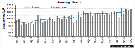The pace of so-called housing starts rose to an annual rate of 1.29 million last month, with construction on single-family homes also hitting the highest level since before the Great Recession. And permits for single-family homes, where building costs and sale prices are the highest, rose 3.1 percent in February to an 832,000 rate that, in good news for a thinly supplied new home market, is up 13.5 percent year-on-year. This is offset, however, by a downturn in multi-family units where permits fell 22 percent in the month to a 381,000 rate that is down a yearly 11.2 percent.