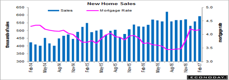 New home sales shot 6.1 percent higher in February to a 592,000 annualized rate that easily beats the Econoday consensus for 565,000 and is near the top estimate of 600,000. Sales seemed to have a boost from builder concessions as the median price fell a monthly 3.9 percent to $296,200 and down 4.9 percent year-on-year.