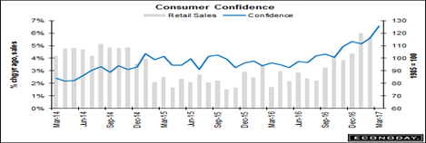 “Consumer confidence increased sharply in March to its highest level since December 2000 (Index, 128.6),” said Lynn Franco, Director of Economic Indicators at The Conference Board. “Consumers’ assessment of current business and labor market conditions improved considerably. Consumers also expressed much greater optimism regarding the short-term outlook for business, jobs and personal income prospects. Thus, consumers feel current economic conditions have improved over the recent period, and their renewed optimism suggests the possibility of some upside to the prospects for economic growth in the coming months.”