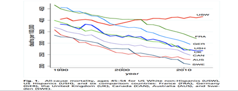 The CBO graph pictures the suffering of 45-54 year-old white working class males in our post-industrial age. The rising red line is white USA males, the falling lines are white males in other developed countries with Sweden having the lowest mortality rate “for all causes”. Even US Hispanics (blue line) had a falling mortality rate.