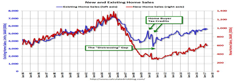 Calculated Risk shows the “Distressing Gap” that occurred with the housing crash, when oversupply of distressed housing caused new-home construction to plummet. It hasn’t yet recovered, but “in general the ratio has been trending down since the housing bust, and this ratio will probably continue to trend down over the next several years,” says Calculated Risk’s Bill McBride.