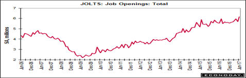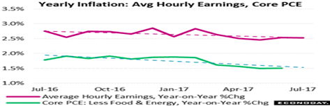 “At 4.3 percent unemployment, earnings in theory should be much higher, at least above 3 percent where many believe it needs to be before feeding into overall inflation,” said Econoday last week. “And overall inflation, tracked here by core PCE prices, hasn’t been moving higher either, dipping to the 1.5 percent line.”
