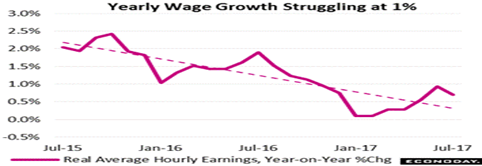 “Real”, or inflation adjusted average hourly earnings slipped 2 tenths in July to a year-on-year 0.7 percent. This reading has been under the 1 percent line since October last year. The monthly reading for this measure did finally show some life in the prior week’s employment report with an unadjusted 0.3 percent gain, but it will take a continued run of strength to level out the 2-year trend line which remains in a deep downslope, says Econoday.