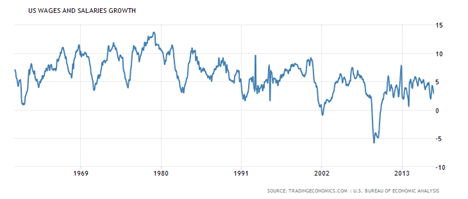 Wages in the United States increased 2.95 percent in May of 2017 over the same month in the previous year. But a better idea of healthy wage growth in the United States is a historical average of 6.26 percent from 1960 until 2017, reaching an all-time high of 13.77 percent in January of 1979 and a record low of -5.77 percent in March of 2009, according to Trading Economics.