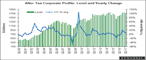 As Nobel economist Joseph Stiglitz has been saying for years, “…it is not as if America’s large corporations were starved for cash; they are sitting on a couple of trillion dollars. And the lack of investment is not because profits, either before or after tax, are too low; after-tax corporate profits as a share of GDP have almost tripled in the last 30 years.”