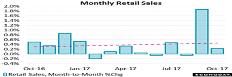 Sad, there is no fiscal responsibility in DC at the moment. Monthly retail sales are helping to boost GDP due in large part to the hurricanes. An upward revision to September puts the monthly retail sales jump at 1.9 percent and a 2-1/2 year high, as consumers in Texas, Florida, Puerto Rico and the Virgin Islands replace autos and everything else lost in the storms. Sales in October understandably slowed but did remain in the plus column at 0.2 percent, said Econoday.